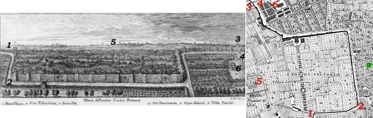 2) Via Tiburtina; 3) Porta Pia; 4) Via Nomentana; 5) "Vigne" (farms/villas) inside the walls; 6) Villa Patrizi. 1), 3) and 6) are shown in other pages.
