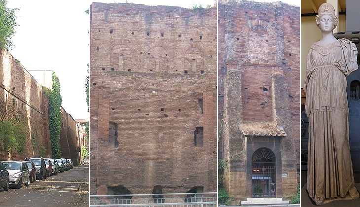 (left to right) Eastern side of the walls; a former gate in the northern side; a small chapel between the projecting walls of a former tower; Centrale Montemartini: statue of Athena which was found in 1882 near Castro Pretorio (IIIrd century BC)