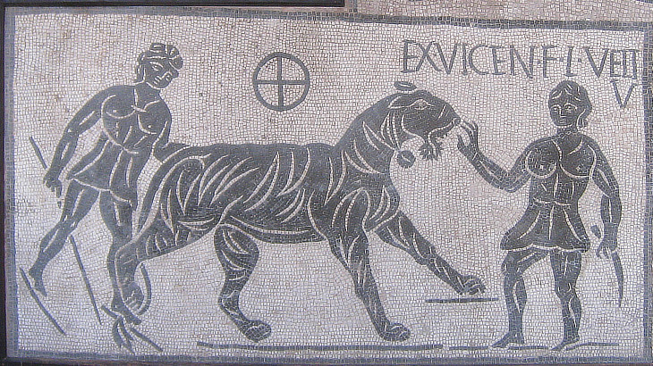 The mosaic records the twentieth anniversary of the reign of Emperor Antoninus Pius. It depicts either a hunting scene or a fight in the amphitheatre; the letter theta indicates that the animal will die and the V near the man stands for vicit (won).
