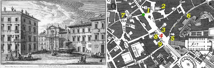 The small map shows also: 5) S. Rita da Cascia; 6) Casa di Pietro da Cortona; 7) Tor Margana; 8) Palazzo Fani; 9) Palazzo Massimo.