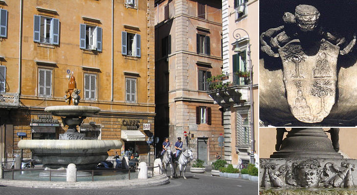 (left) The fountain; (right-above) coat of arms of Pope Alexander VII; (right-below) detail of the decoration