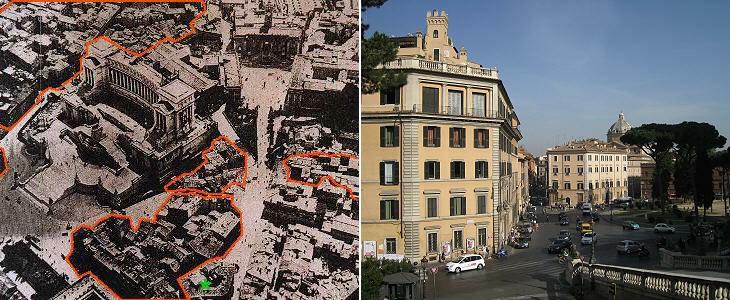 (left) Aerial view of the area before the 1920/1930s changes: the red border surrounds the buildings which were pulled down; the green asterisk indicates Palazzo Muti Bussi; (right) view from Piazza del Campidoglio which shows the effect of demolitions