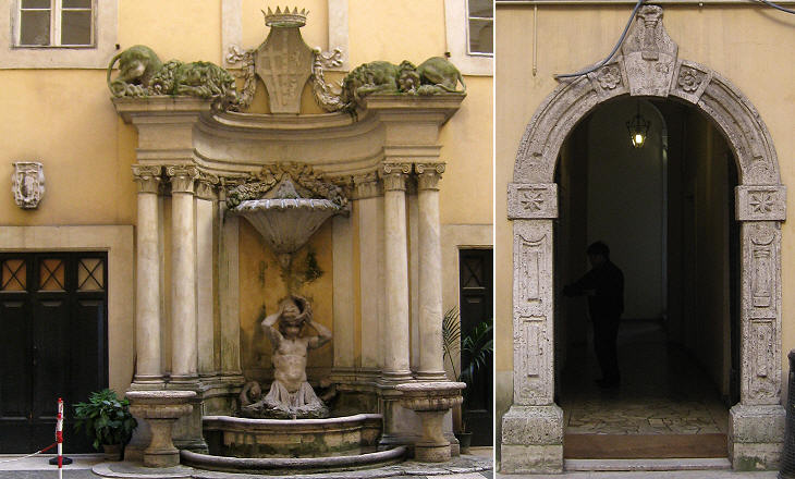 (left) Fountain in the courtyard (see other fountains in courtyards) with the coat of arms of the Massimo and resembling Fontana del Tritone; (right) inner portal with the heraldic symbol of the Colonna family