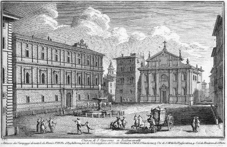 Poco dopo siegue quest'antico e magnifico palazzo edificato da Bramante Lazzari, e posseduto per lungo tempo da' Re d'Inghilterra, ma