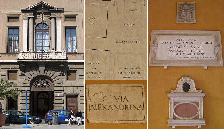 (left) Enlarged view of the portal and of the balcony (and girls waiting to board a Hop-on Hop-off bus); (centre-above) plaque in the courtyard of the building showing its previous (in yellow) and new (in black) locations; (centre-below) plaque which was walled on the northern façade of the palace; (right) coat of arms of Pope Alexander VI and two plaques making reference to Raphael