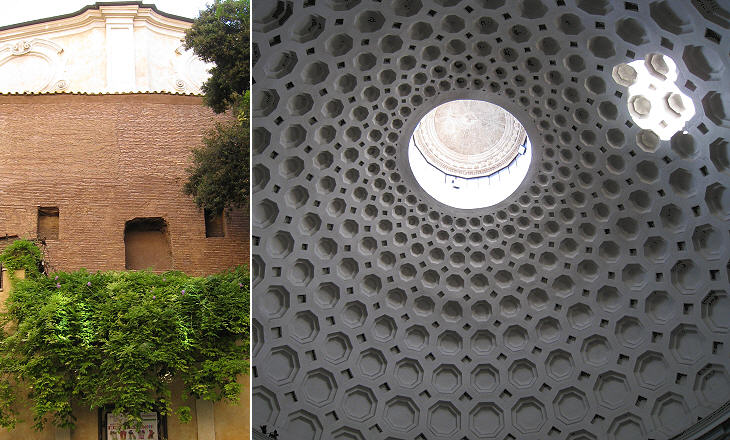 (left) Ancient Roman wall seen from Via Torino; (right) interior of the dome