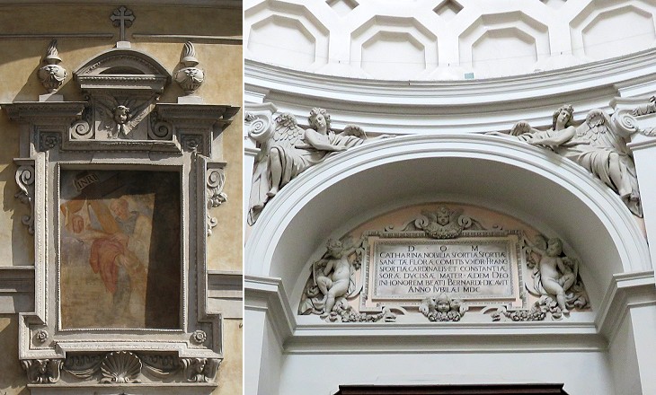 Stucco decoration: (left) frame of a fresco on the façade which portrays St. Bernard of Clairvaux holding the Cross to which the Veil of Veronica is attached; (right) rear façade with inscription celebrating the completion of the church in the 1600 Jubilee Year