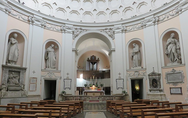 Chiesa di S. Bernardo a TerminiNon prima dell'anno 1598. fu ridotto in chiesa quest'ammirabile avanzo delle Terme Diocleziane, in onore di s. Bernardo, e accanto vi fu eretto il monastero per li monaci del medesimo Santo, della riforma però fatta dal venerabile D. Gio. Barriero abate Furiense di Tolosa, il corpo del quale giace a sinistra dell'altare maggiore. È questa di figura circolare, e vi sono stati adattati delle nicchie ed altari d'intorno, ornati di stucchi, e di pitture. Il Cav. Odazj vi fece li due gran quadri, e Cammillo Mariani da Vicenza le otto statue di stucco collocate nelle nicchie; la statua però di s. Francesco, ed altro nella cappella laterale sono lavori in marmo di Giacomo Antonio Fancelli. Nell'orto di detto monastero si vedono delle rovine delle medesime Terme in forma di teatro, e vi fu adattata una cappella dedicata a s. Caterina. |