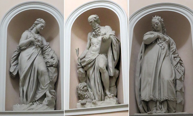 Stucco statues by Camillo Mariani (1600): (left) St. Mary Magdalene; (centre) St. Jerome; (right) St. Catherine of the Wheel