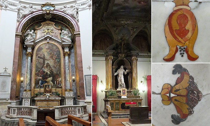 (left) Altar to St. Bernard; (centre) Chapel of St. Francis; (right) marble inlays on the balustrades of the altars