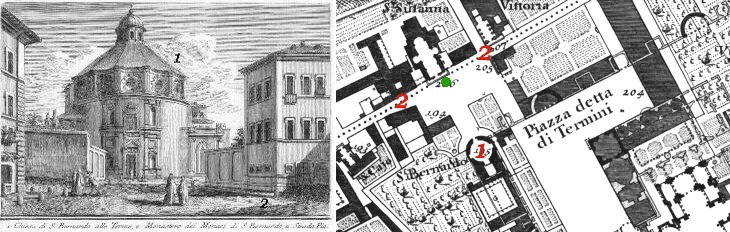 The view is taken from the green dot in the 1748 map below. In the description below the plate Vasi made reference to: 1) S. Bernardo alle Terme;