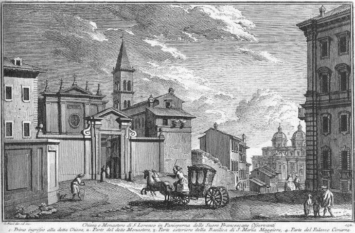 Chiesa di s. Lorenzo in fonte, e strada della suburraSi dice questa contrada la nuova suburra, a distinzione dell'antica, che era presso la chiesa de' ss. Pietro e Marcellino, e però vi fu posta quivi sul cantone una insegna formata in marmo. La strada, che siegue dritta, porta al monastero di s. Lucia in Selce, e a s. Martino ai monti, e poi alla porta s. Lorenzo; voltando però per la strada, che sta incontro alla detta insegna, che dicesi Urbana, si trova in primo luogo la chiesa di s. Lorenzo in Fonte molto celebre, perchè eretta nella prigione del Santo, in cui s. Ippolito cavaliere Romano, convertito alla Fede dal s. Diacono, fu battezzato nel fonte miracolosamente ivi sorto, come si vede espresso nel quadro sull' altare maggiore da Gio. Batista Speranza, il quale fece il resto delle pitture, fuorchè un s. Vescovo, e s. Francesco, per essere opera del Cav. d'Arpino, e le pitture nella prima cappella sono del Cipolla.Chiesa di s. Lorenzo in PanispernaDopo la suddetta chiesa camminando a destra, ci viene di prospetto la villa di Sisto V. a destra la tribuna della basilica di s. Maria Maggiore, e a sinistra il detto monastero colla chiesa. Questa fu eretta nel luogo delle terme Olimpiade, ove il s. Diacono fu arrostito sulla graticola, acciò si conservasse la memoria del suo martirio. Era prima una delle 20. badie privilegiate di Roma, e fu molto frequentata da s. Brigida, mentre stette in Roma. Ora vi sono le religiose di santa Chiara, le quali hanno adornata la chiesa di marmi, stucchi dorati, e pitture; Pasquale Cati vi dipinse il prospetto dell'altare maggiore; Cherubino Alberti il s. Francesco; e Cesare d'Arpino la s. Brigida, lo sposalizio della ss. Vergine, e la volta della chiesa. |