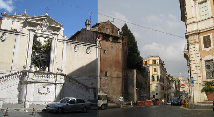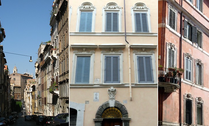 (left) Western section of Via Panisperna ending at SS. Domenico e Sisto; (centre) Palazzetto Cartoni in Via Panisperna; (right) detail of the XVIIIth century building at the