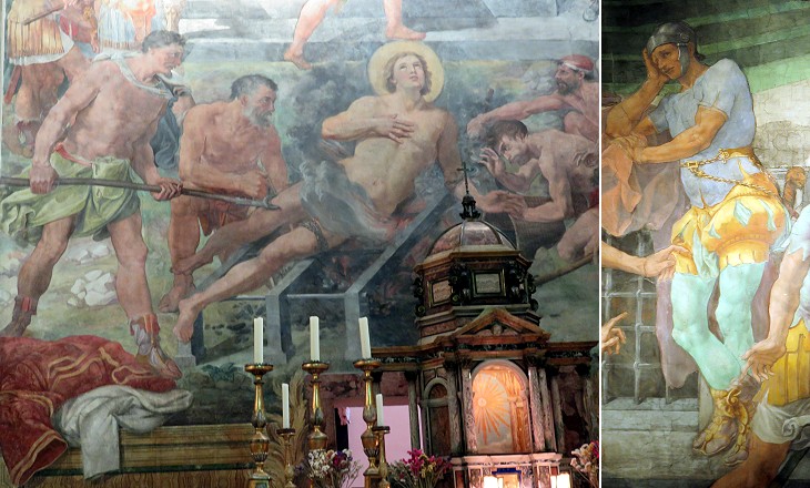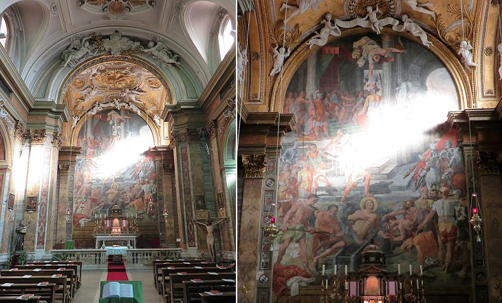 The fresco is unique because usually the main nave of a Roman church ends with an apse, the decoration of which is split into sections. In a way it calls to mind the Last Judgement by Michelangelo which covers the whole flat wall of Cappella Sistina. The emphasis on martyrdoms eventually led to the depiction of some gruesome details, but Cati's work is full of light and colours: St. Lawrence does not seem to care about the heat of the fire and a Roman soldier chooses to take a nap rather than watching the events.