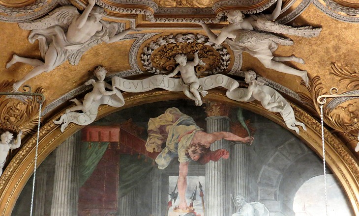 In 1757 the interior of the church was entirely redecorated with gilded stuccoes at the initiative of Cardinal Johann Theodor von Bayern, but Cati's fresco was not affected
