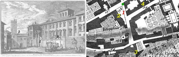 In the description below the plate Vasi made reference to: 1) First entrance to the nunnery; 2) Steps leading to the main entrance; 3) Tower (Torre de' Capocci) and S. Lucia in Selci, another nunnery. The map shows also 4) Palazzo Ravenna.