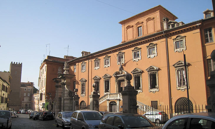 The nuns completed a renovation of the building in 1740, but they did not delete all the references to the former owners of the building and the Italian State in turn did not delete the references to the nuns. The image used as background for this page shows a detail of the fence portal where the coat of arms of the Italian Kingdom was added below an existing decoration (one of the many laughing masks which smile from Roman buildings and monuments).