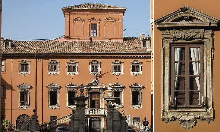 (left) Central part of the casino; (right) a window with a decoration including quince flowers and fruits, heraldic symbol of the Sforza, which can be noticed also in some halls of Palazzo Barberini