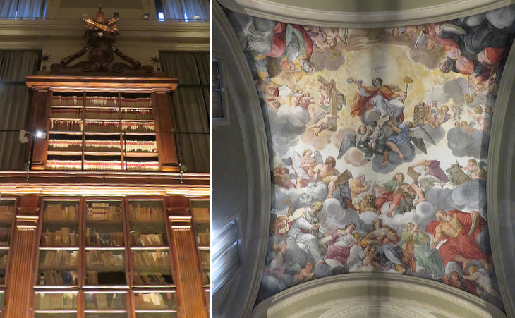 Biblioteca Alessandrina: (left) bookcase with the coat of arms of Pope Alexander VII; (right) fresco by Clemente Majoli depicting the Triumph of Religion (1662-1665); it follows a pattern established by Pietro da Cortona at Palazzo Barberini
