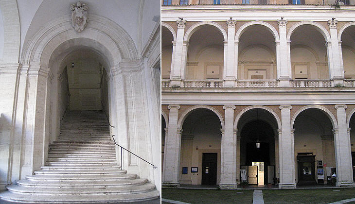 For some time the design of Collegio Romano was attributed to Bartolomeo Ammannati, but it is now generally believed that the building was designed by Giuseppe Valeriani, a Jesuit brother. Whoever the architect, he had to deal with the unusual shape of the area chosen for the building (a trapezium); of the two portals, only one was actually needed (it leads to the large courtyard around which the palace is structured); the other one had only an aesthetic purpose.