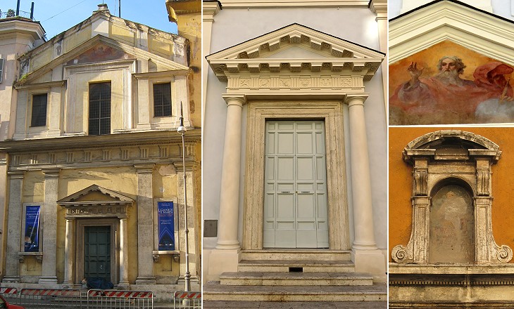 (left) Façade (before being repainted); (centre) portal; (right-above) fresco at the top of the façade; (right-below) detail of the entrance to the nunnery