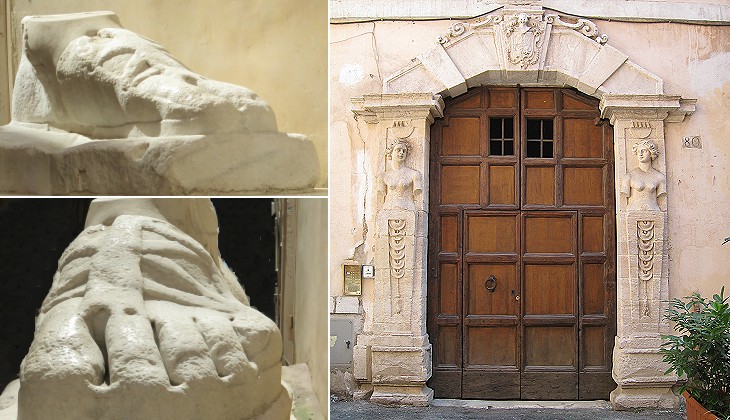 (left) Piè di Marmo (see a page on Roman feet and sandals); (right) portal of Palazzo Frangipane