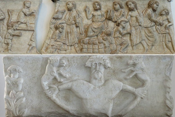 Other exhibits from Museo Kircheriano: (above) Museo Nazionale Romano: Early Christian sarcophagus, where Jesus is depicted in a typical Roman attire; (below) Museo dell'Alto Medioevo: Xth century relief depicting the Ascension of Alexander the Great