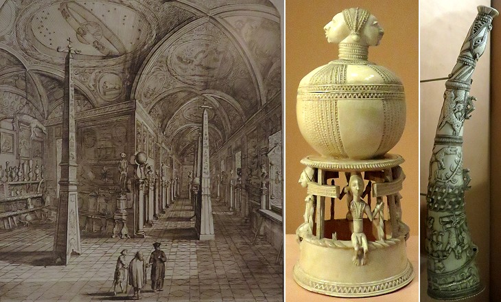 Museo Nazionale Preistorico Etnografico: (left) 1678 etching depicting Museo Kircheriano; (centre/right) early XVIth century ivory salt cellar and horn from Sierra Leone (from Museo Kircheriano). Father Kircher asked Jesuit missionaries to send him artefacts of the faraway lands where they lived
