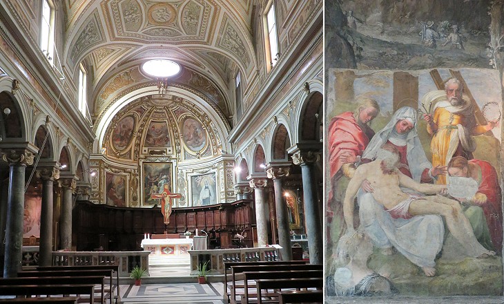(left) Interior; (right) fresco by Perin del Vaga (early XVIth century) depicting a Deposition which brings to mind the statue by Michelangelo; see his paintings in the Papal Apartments at Castel Sant'Angelo