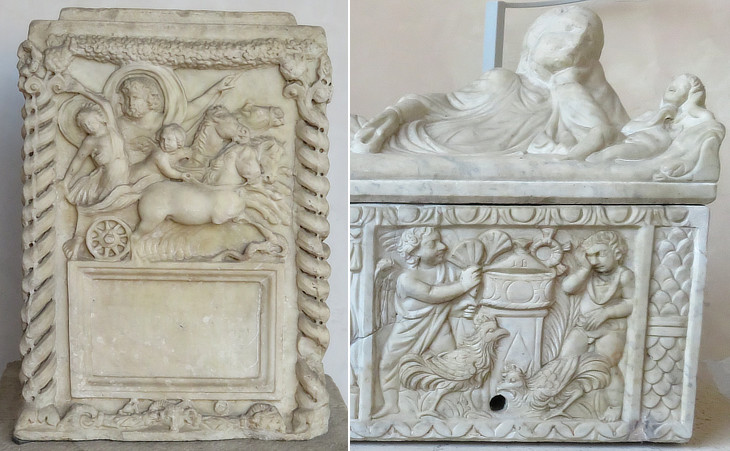 Museo Nazionale Romano - other exhibits from Museo Kircheriano: (left) cinerary urn without inscription depicting the Rape of Proserpina (IInd century AD); (right) detail of a IVth century AD sarcophagus of a boy depicting a fight between cocks (see a mosaic from Pompeii)
