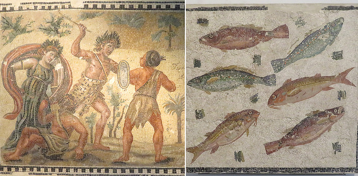 Museo Nazionale Romano - other exhibits from Museo Kircheriano: mosaics: (left) Dionysus/Bacchus in India (early IVth century AD - see a grand floor mosaic depicting the Triumph of Dionysus/Bacchus at Sousse and a sarcophagus at Lyon); it was found at Villa la Rufinella; (right) fish (Ist/IInd century AD)