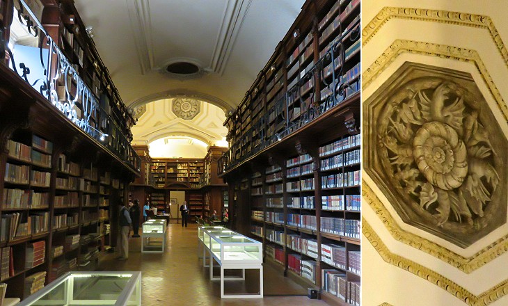 (left) A hall of Biblioteca di Archeologia e Storia dell'Arte al Collegio Romano (Sala della Crociera); (right) ceiling decoration showing the dragon of Pope Gregory XIII