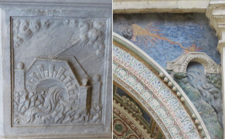 A bridge struck by a lightning, a less known symbol of the Altemps: (left) on a well head; (right) in the courtyard fountain