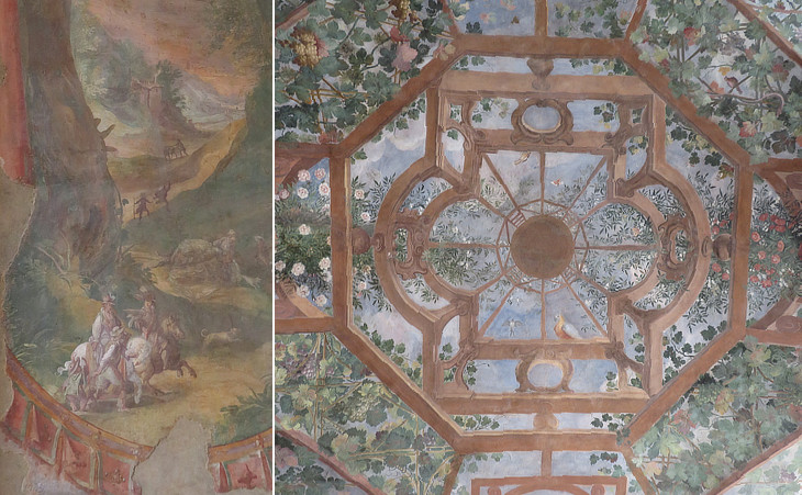Northern loggia: (left) detail of a fresco on a side wall depicting a landscape and a hunting scene, a subject which was made popular in Rome by Flemish painters, e. g. Paul Bril; (right) ceiling depicting an aviary by Antonio Viviani which recalls to mind those at Villa Giulia and at Palazzo Farnese di Caprarola; see other works by Viviani at Palazzo Barberini and S. Girolamo degli Schiavoni