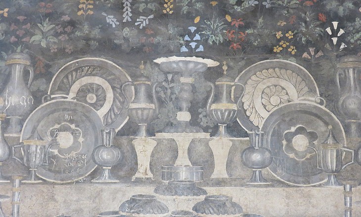 In 1982 Palazzo Altemps was bought by the Italian State and efforts were made to recover its original decoration. One room had a fresco depicting tableware, most likely that which was employed for the banquet of the wedding between Girolamo Riario, nephew of Pope Sixtus IV, and Caterina Sforza in 1477. The palace was originally built for the Riario. In 1511 they sold it to Cardinal Francesco Soderini of a Florentine noble family allied with the Medici.