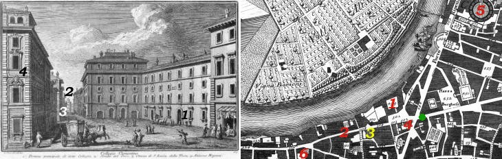 In the description below the plate Vasi made reference to: 1) Main entrance to Collegio Clementino; 2) Strada dell'Orso (bear); 3) S. Lucia della Tinta; 4) Palazzo Negroni. The map shows also 5) Mausoleo di Augusto; 6) Palazzo Primoli. The dotted line in the map delineates