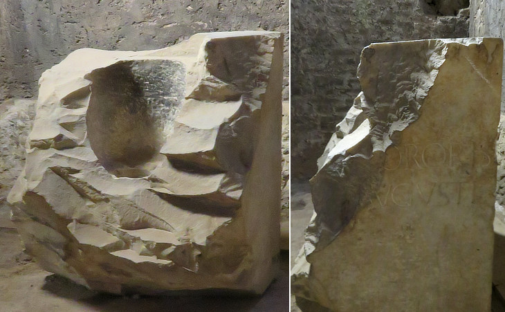cylindrical pillar contained two small square chambers one upon the other, probably for Augustus (above) and his closest relatives (below).