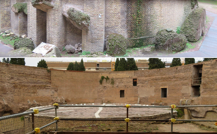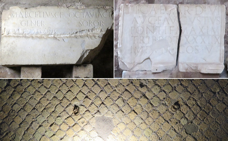 (above-left) Inscription indicating the site of the cinerary urns of Octavia and Marcellus, her son and son-in-law (Gener) of Augustus; (above) dedicatory inscription to Tiberius in the year of his death ("tribunicia potestas XXXIIX" i.e. 37 AD); (below) original wall of the mausoleum in "opus reticulatum"