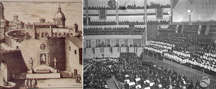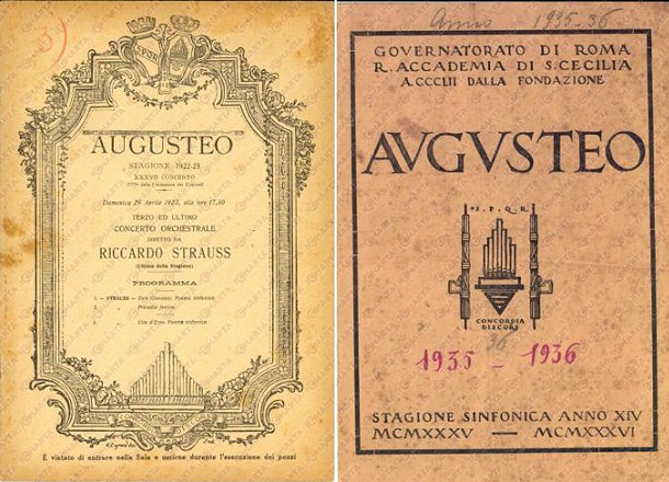Eventually the open-air theatre was covered with a dome and in 1908 it was turned into a concert hall (Augusteo), which was renowned for its acoustics. You may wish to see two concert programmes (it opens in another window), one of which by Accademia Musicale di S. Cecilia. On May 13, 1936 it hosted its final concert: Bernardino Molinari conducted music by Rossini, Martucci, Paganini-Molinari, Respighi, Wagner and Verdi.