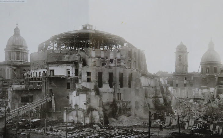 1938 photo of the demolition of the northern section of the Concert Hall; it shows also: (left) dome of S. Carlo al Corso; (right) bell tower of S. Girolamo degli Schiavoni and dome of S. Rocco
