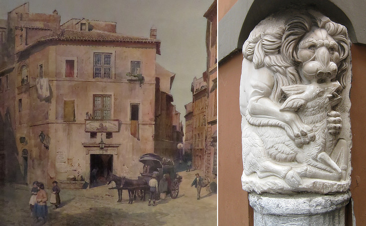 (left) Museo di Roma in Trastevere adjoining S. Egidio: Albergo dell'Orso in the 1880s in a painting by Ettore Roesler Franz; (right) copy of another relief from a sarcophagus near Albergo dell'Orso (see similar reliefs in a sarcophagus at Musei Vaticani)