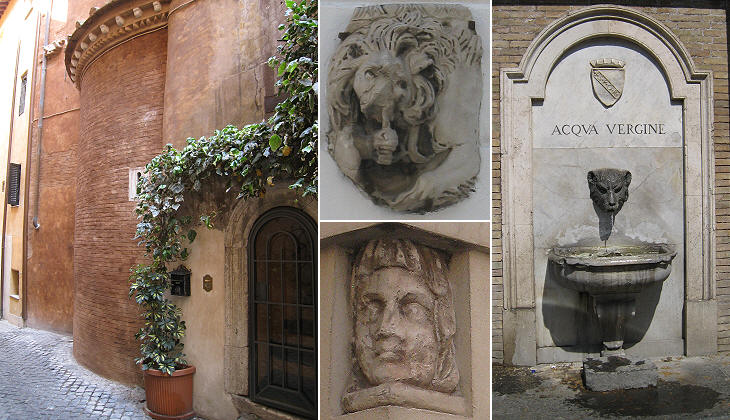 (left) Medieval apse of S. Lucia della Tinta; (centre) reliefs on nearby buildings; (right) modern fountain "dell'Orso"; it was supplied by Acqua Vergine