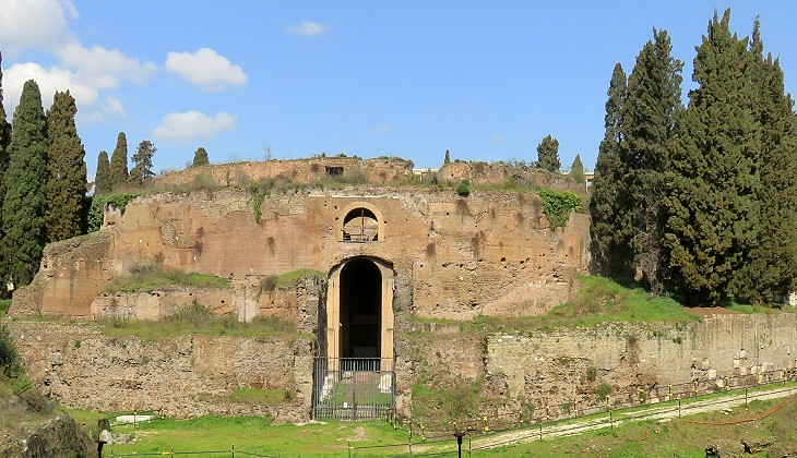 Mausoleo di Augusto; its entrance was flanked by two obelisks without hieroglyphs which are now on the Esquiline Hill and at Piazza del Quirinale