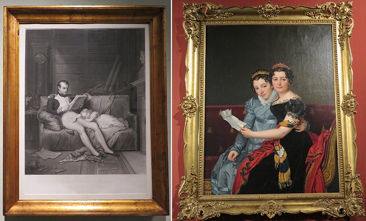 (left) Emperor Napoleon reading a tale to his son in a XIXth century print; (right) Jacques-Louis David: Zénaïde and Charlotte Bonaparte, nieces of Emperor Napoleon