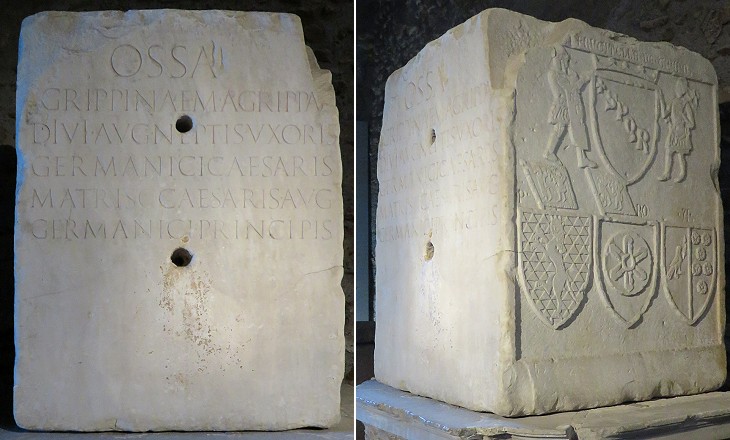The pedestal of Agrippina the elder, daughter of Agrippa, wife of Germanicus, and mother of Caligula (..) was hollowed out during the Middle Ages, turned into standard measures for solids, and as such placed at the disposal of the public in the portico of the city hall. (..) As soon as Caligula succeeded Tiberius in the government of the empire, he sailed to Pandataria (Ventotene), collected the ashes of his mother and relatives, and ultimately placed them in the mausoleum. The cippus is manifestly the work of Caligula, because mention is made on it of his accession to the throne. Lanciani