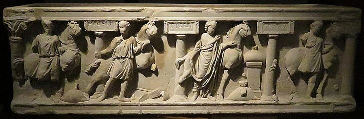 Kunsthistorisches Museum of Vienna: Roman sarcophagus from the Soderini Collection; it depicts the four horses of a racing chariot being rewarded with bags of money; the inscription is unrelated: "Respice et crede: hoc est, sic est, aliut fieri non licet" (look and believe: this is it, it is how it is, it cannot be otherwise)