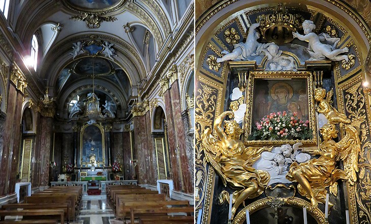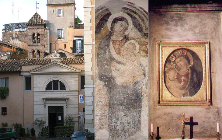 (left) Interior of the church; (right) XVIIIth century altar of "Madonna della Lampada", a sacred image which stood outside the church. In 1577 when a flood covered Isola Tiberina its lamp continued to burn under the water. A modern copy of the image can be seen on the base of the bell tower