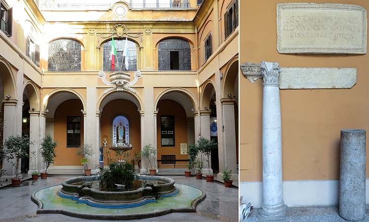 The layout of the hospital was redesigned in the 1930s, but a courtyard on the back of the church matches that shown in the 1748 map. It retains elements of its XVIIIth century stucco decoration. It houses some ancient columns and inscriptions which were found in the XIXth/XXth centuries. A large and fine inscription refers to L. Cornelius as an architectus. He most likely was involved in the design of Tabularium.