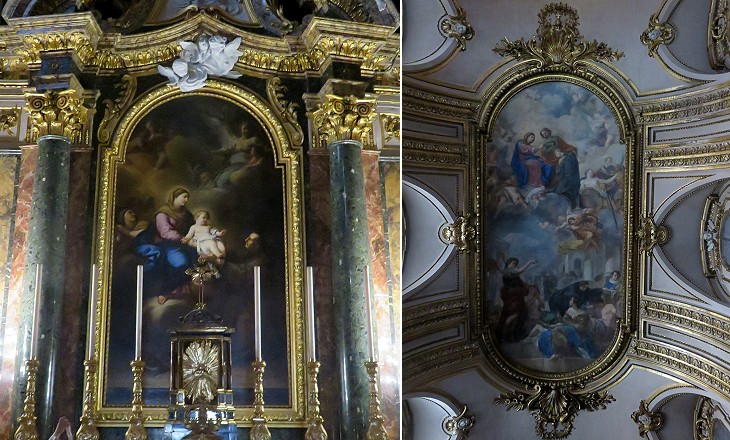 (left) Main altar: The Virgin Mary shows the Child to St. John of God by Andrea Gennaroli (1640) with additions by Corrado Giaquinto; (right) Glory of St. John of God by Giaquinto (1742). This painter who started his career in Naples refrained from the illusionistic features which characterized many Roman ceilings; see other of his paintings at S. Nicola dei Lorenesi and S. Croce in Gerusalemme