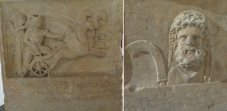 Musei Capitolini: sides of the altar to "Soli Sanctissimo": (left) Palmyrene inscription under a relief portraying god Malakbel on a chariot drawn by griffins; (right) Silvanus (see a fine relief portraying Antinous as Silvanus)